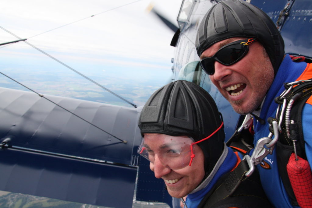 Bei dem 20-minütigen Steigflug unserer Antonov-2 auf 2500 Meter kannst Du in aller Ruhe die Landschaft genießen. In unserem Absetzflugzeug sitzt Du direkt neben Deinem Tandemmaster am Fenster. Kurz vorm Erreichen der Absetzhöhe klinkt er Dich in das Gurtzeug ein und Ihr geht zur Tür. Spätestens jetzt gibt es kein Zurück mehr und nach einem kurzen Blick zum Piloten rauscht ihr mit 200 km/h der Erde entgegen.