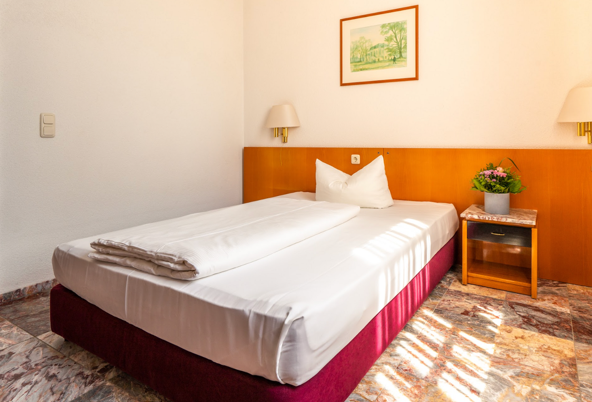 Unsere Einzelzimmer sind mit einem Bett der Größe 1,40 x 2,00m ausgestattet. Dazu kommt noch Kabel-TV, Föhn, Bad mit Dusche/Wanne und vieles mehr. In allen Zimmern ist kostenfreies WLan vorhanden.